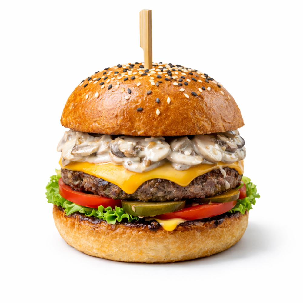Котлета из отборной говядины, фирменная булочка, соус Грибной, томаты, сыр Чеддер, микс салата