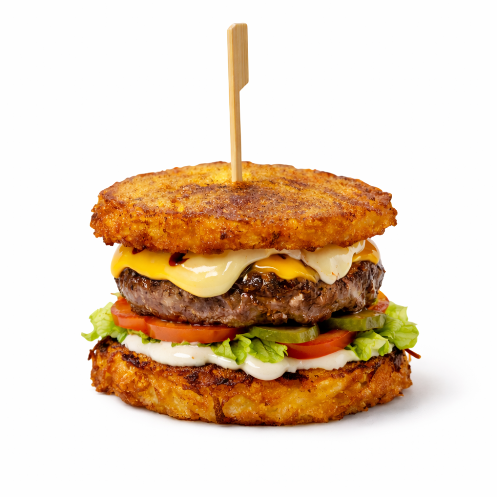 Бургер с фирменной котлетой из 100% бразильской говядины травяного откорма, ароматным сыром Чеддер, томатами, маринованными огурцами, горчично-сметанным соусом. Всё это — между двумя хрустящими золотистыми драниками.