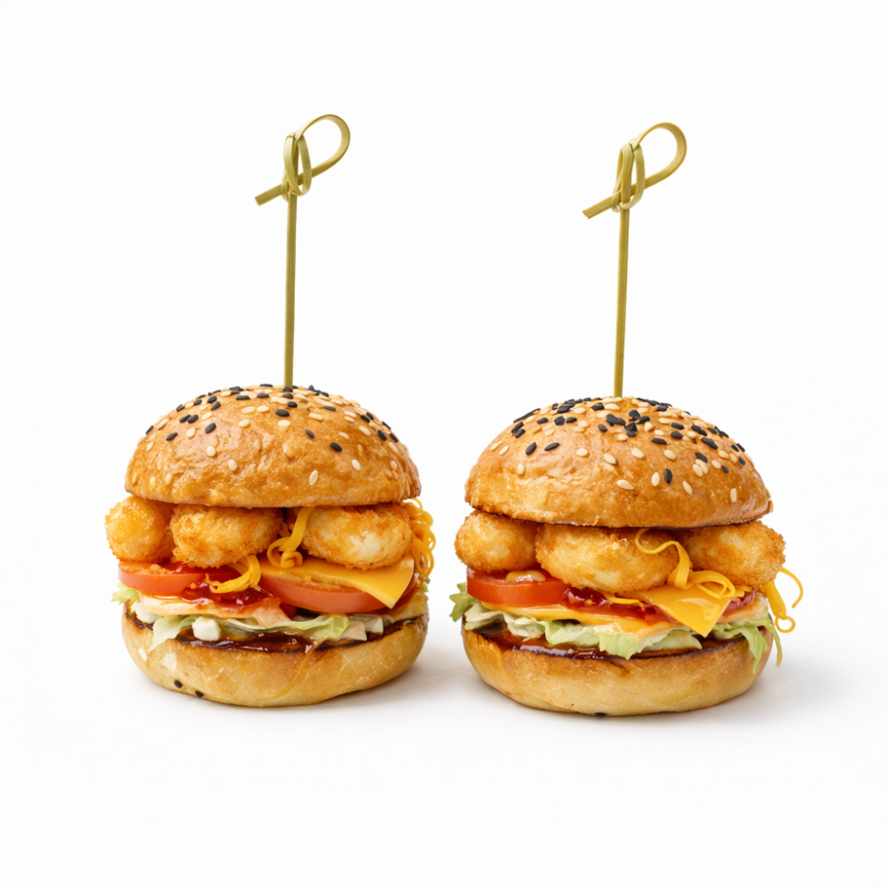 Два аппетитных мини-бургера с креветками Ваннамей, сыром Чеддер и соусом Сладкий Чили