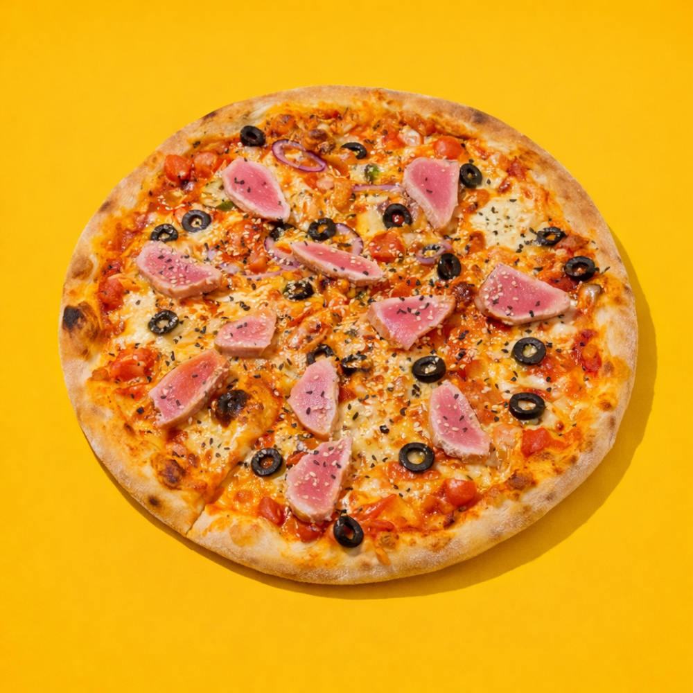 Томатная основа, тунец средней прожарки, красный лук, маслины, кунжут Тунец прожарки медиум, сыр Моцарелла, красный лук, маслины, фирменный соус из томатов, кунжут