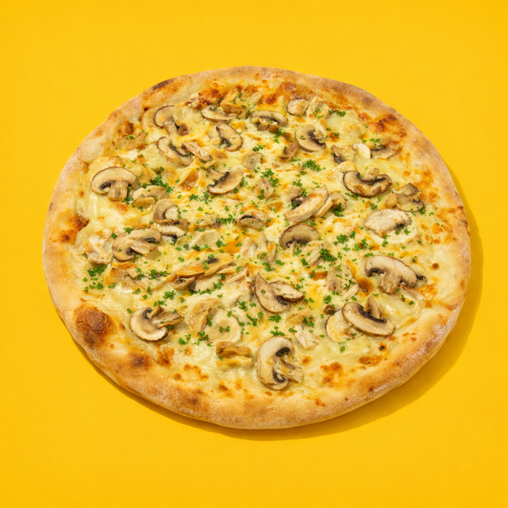 Запеченный цыпленок, сыр Моцарелла, шампиньоны, сливочный соус, трюфельное масло, петрушка