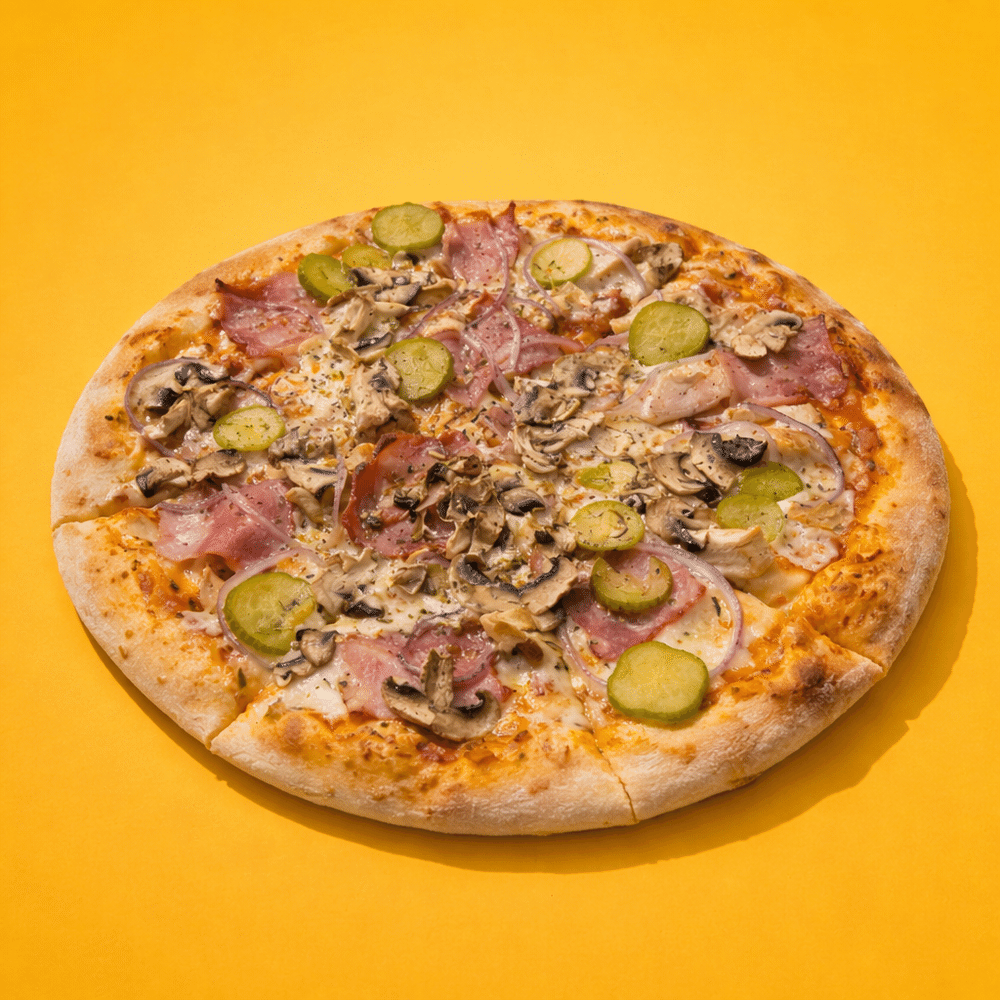 Бекон, куриное филе, шампиньоны, сыр Моцарелла, красный лук, маринованные огурцы, фирменный соус из томатов, базилик