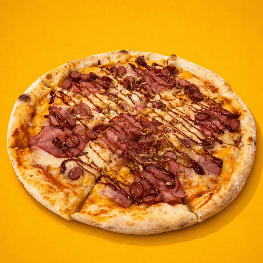 Сыр Моцарелла, бекон, ветчина, колбаски с луком, соус Барбекю, лук фри, фирменный соус из томатов