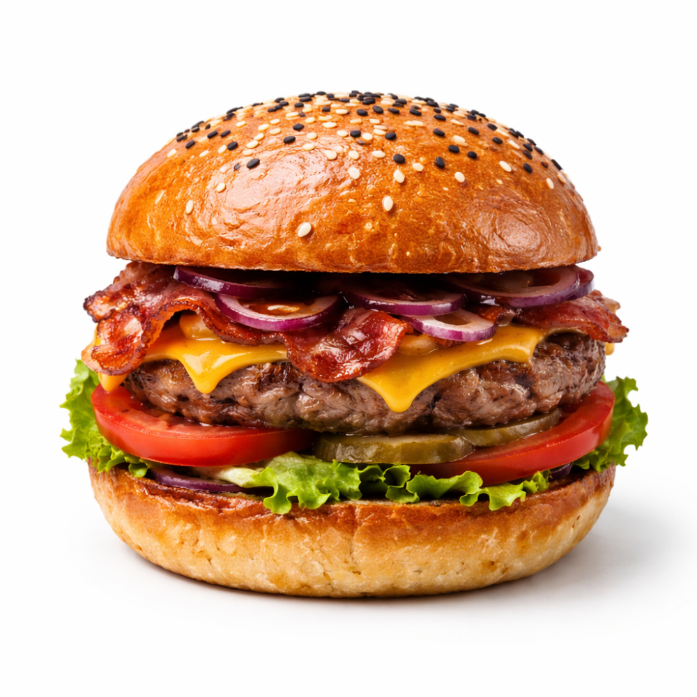 Котлета из отборной говядины, фирменная булочка, бекон сырокопченый, томаты, сыр Чеддер, соус BBQ, маринованные огурчики, микс салата, лук красный